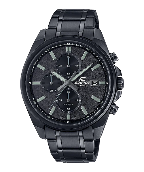 A mid-size standard EDIFICE chronograph. Designed with a modern, sporty theme, the model has a thin bezel and wide dial with simple designs. The case and band have a black ion plate finish that resists scratching.