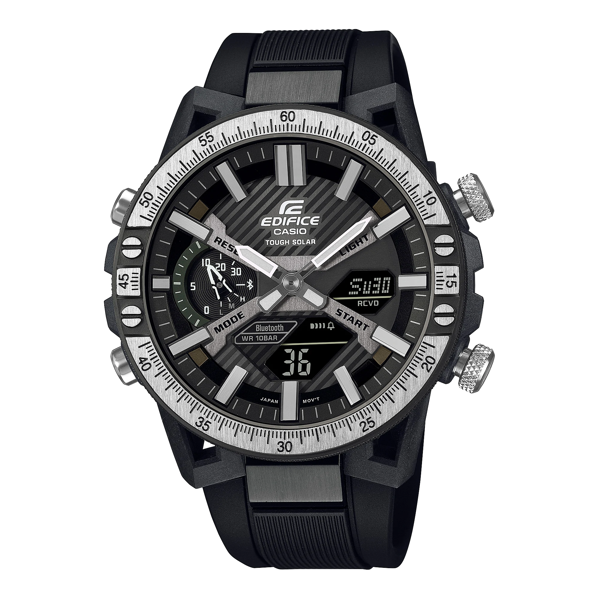 EDIFICE AUTOMOTIVE TOOLKIT INSPIRED DESIGN SERIES Fine-tune your power and precision with a bold, intricate design inspired by professional automotive instruments. A special high-performance motorsports watch, the EDIFICE ECB-2000TP, boasts the solid sophistication and fine detailing of an auto lover’s toolkit. This timepiece incorporates the unique case design of the EDIFICE SOSPENSIONE ECB-2000 inspired by the double wishbone configuration of formula car suspension. To complement the strength and solidity of the overall design, the metal bezel is finished in a powerful two-tone combination of black and silver — with the initial black ion plating polished to remove the black from the top of the bezel, exposing the silver beneath. Detailed measurement markings and knurling exude the boldness, precision, and quality look of the professional tools and specialized instruments that inspired these timepieces. It’s a snap to sync with your smartphone via Bluetooth®. Tap into the app to access functions so important to any car enthusiast — get automatically adjusted precision timekeeping, effortlessly manage the world time list of over 300 cities around the world, transfer stopwatch data measured to the millisecond to your smartphone, find your phone just by pressing and holding a button on your watch, and more! Tough Solar charges the watch from sunlight or even fluorescent lamp light.