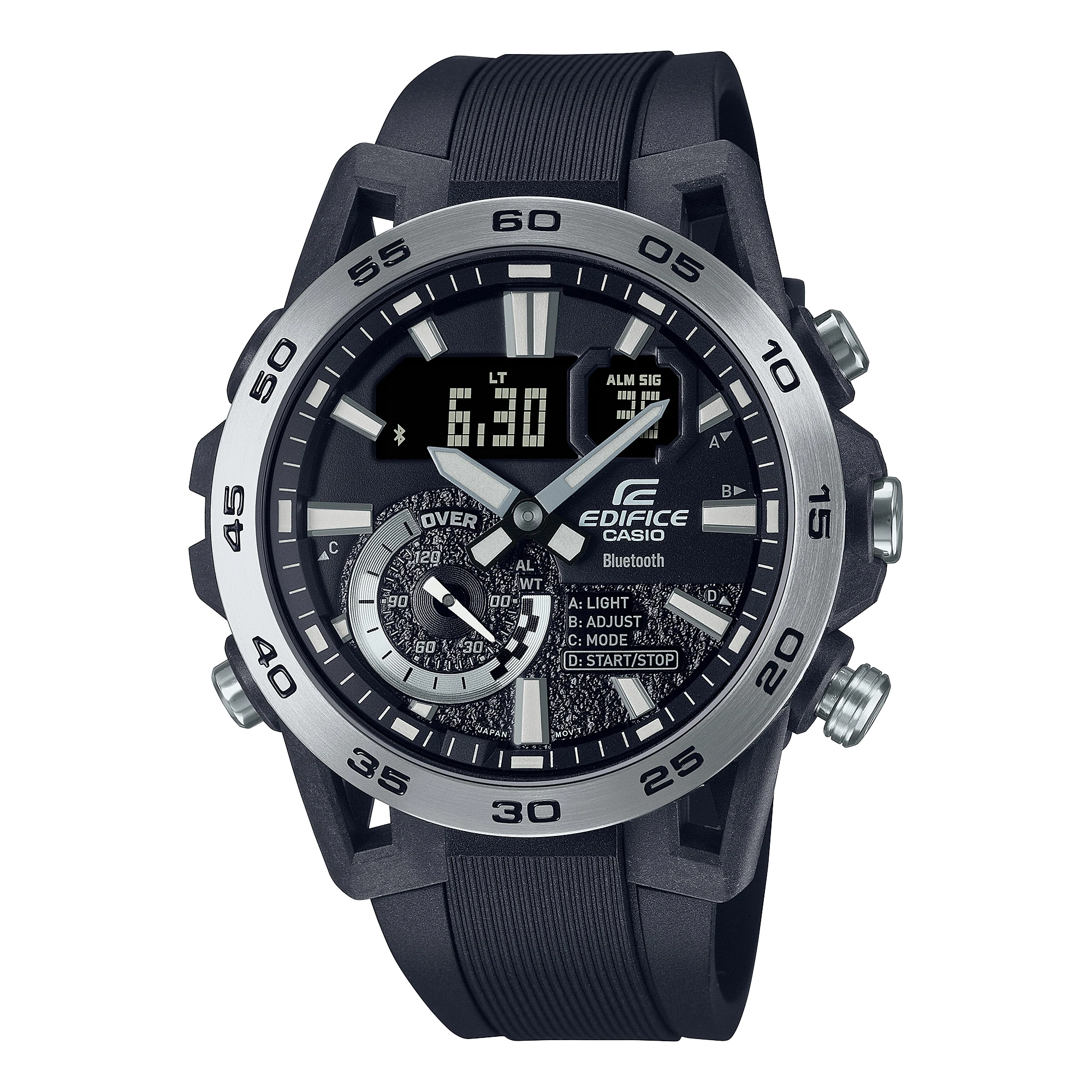 Introducing true motorsports form, functionality, and sophistication — the EDIFICE SOSPENSIONE ECB-40, with carbon fiber reinforced resin suspension arm design and Smartphone Link. The unique case design is inspired by formula car suspension with lugs configured in a four-arm arrangement, two above and two below. Carbon fiber-reinforced resin delivers a case that is lightweight, yet strong. Thanks to Smartphone Link, this special timepiece automatically connects when within range of a paired smartphone. Tap into the app to access functions that are so important for racing teams — get automatically adjusted to-the-second precision timekeeping, effortlessly manage world time, and transfer stopwatch data measured to the millisecond for up to 200 lap times to your smartphone. The Super Illuminator high-luminosity double LED illuminates the digital-analog display for easy readability, even in the dark.