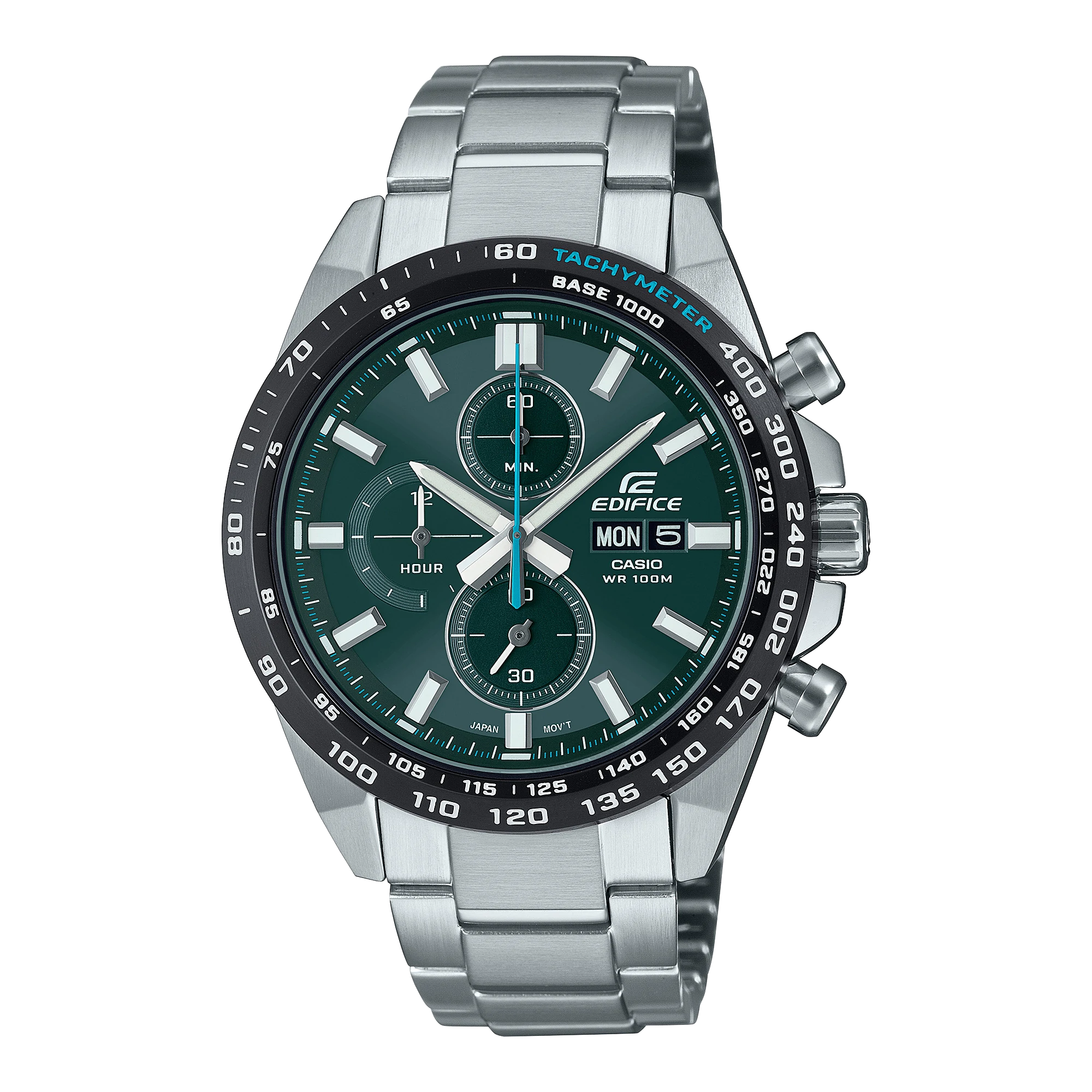 Make a dynamic, bold statement — a classic EDIFICE chronograph in a design that is all about sports. The second hand features a center line in blue to stand out against the green dial and black ion-plated bezel, for an extra sporty touch. Day and date display for handy reference.