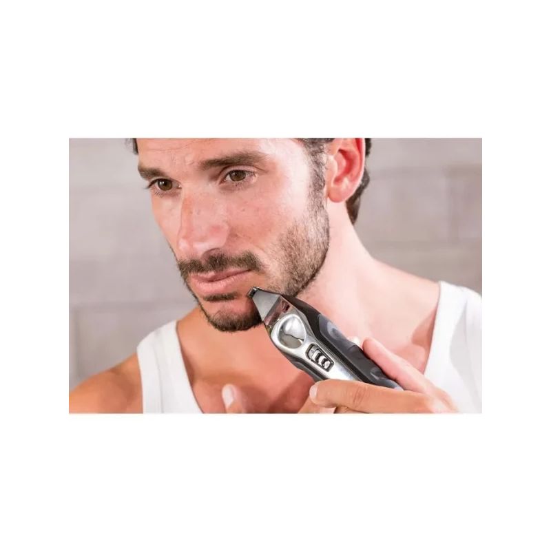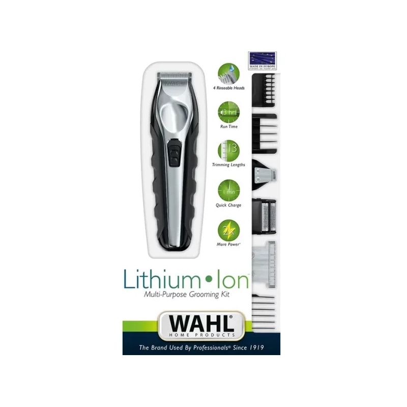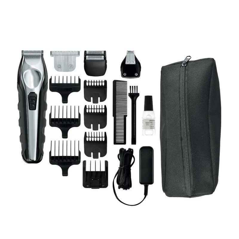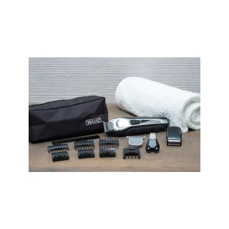 Inside the Box: 1 WAHL Multi-Purpose Grooming Kit, Trimmer Blade, Detail Trimmer Blade, Dual Foil Shaver, T-Blade Head, 3 Beard Guide Combs, 6 Position Guide Combs, 3 T-Blade Guide Combs, charger, beard/moustache comb, pouch, cleaning brush, blade oil, and instructions manual.