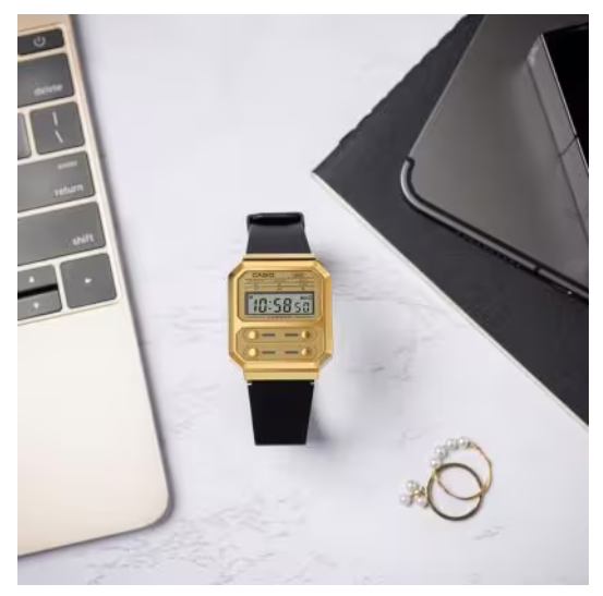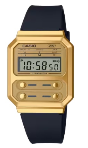 Paying homage to the F-100, the first Casio watch designed with a resin case, the A-100 line commemorates the iconic four front buttons, adding vintage-style metallic components for an updated reboot of a true classic.
