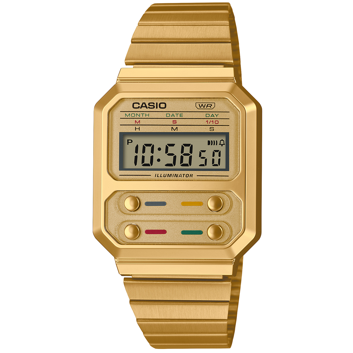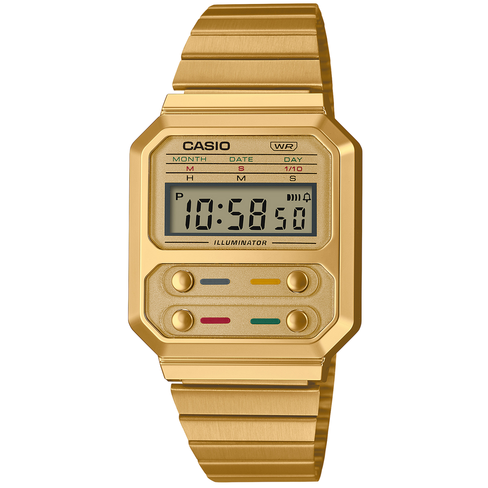 The A100 series is a reproduction of the F-100, CASIO's first resin case model. The design has been updated for this more modern version while retaining the distinctive layout of the F-100's four front buttons along with CASIO vintage metal elements.