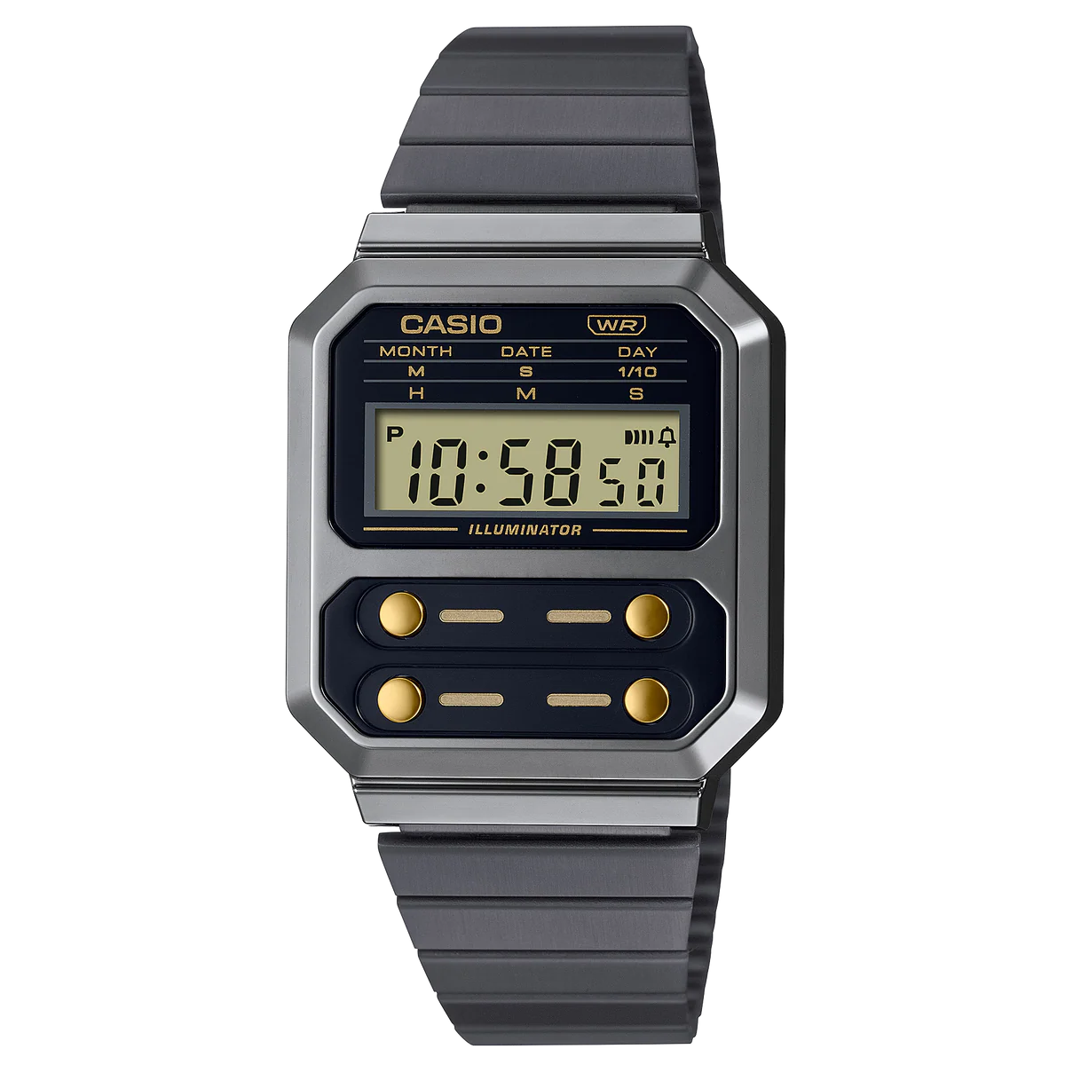 Paying homage to the F-100, the first Casio watch designed with a resin case, the A-100 line commemorates the iconic four front buttons, adding vintage-style metallic components for an updated reboot of a true classic.