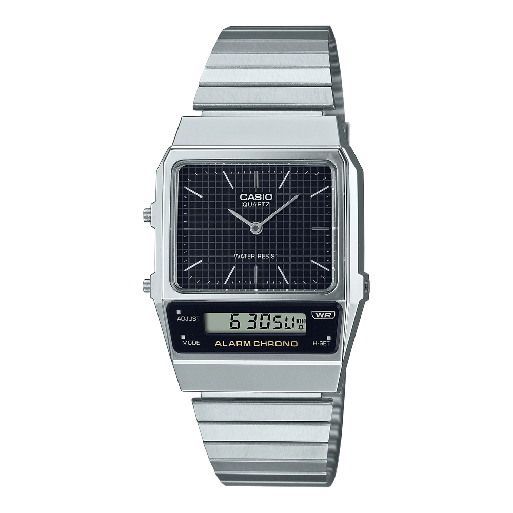 Reboot your retro vintage style with a contemporary update on the 1980s AQ-450 design. This brand-new vintage style watch is a beautiful blend of retro and stylish. A separate dial and LCD serve up analog beauty alongside digital performance. The LCD angles gently to follow the lines of the lugs, while the analog dial features simple bar index marks. The watch face adorned in a grid pattern adds the final touch for a real retro feel. The combination of the angular case and the straight links of the metal band is a simple and stylish celebration of structural beauty. More than just a fashion statement, these timepieces deliver practical functions like dual time, stopwatch, and alarm, as well as water resistance for daily use to free you from worry, even on rainy days.