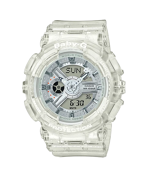 A model inspired by the design of the GA-110, a popular model in the G-SHOCK big case series. The GA-110 combines various parts such as the dial and indices in a complex manner. Its gear-inspired parts and three-dimensional dial create a complex, mechanical impression. This model is smaller and thinner to fit a feminine wrist while retaining the coolness of G-SHOCK. The three-dimensionally arranged indices are painted with a glittering, metallic coat for a refined texture. This gives the watch a sharp and energetic impression. The side buttons are made easy to press and are thus more practical. The BABY-G, a watch with a complex mechanical dial that gives it personality and looks great on the street fashion scene.