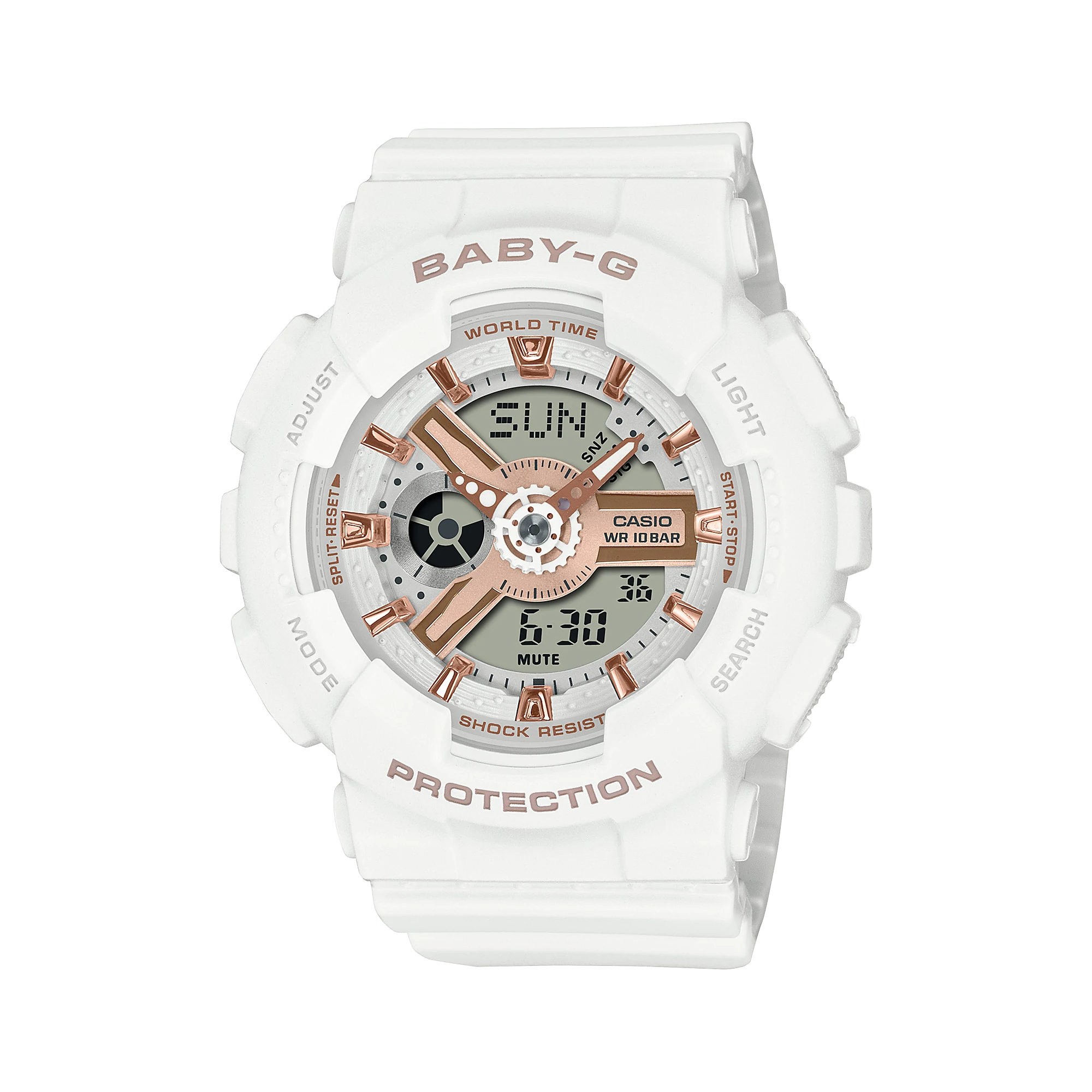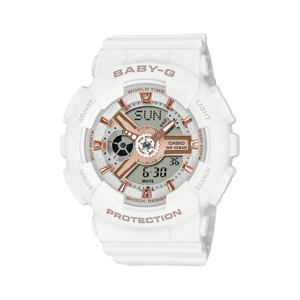 Slip on a splash of clean, fresh color with an eye-catcher inspired by the popular design of the G-SHOCK GA-110. The intricate combination of dial, index markings, and other components evokes mechanical gears with a pop of sharpness that adds a burst of energy. A standout in street fashion, this BABY-G delivers function, as well. Enjoy handy, reliable functions like LED lighting and stopwatch, as well as the shock and water resistance you count on.