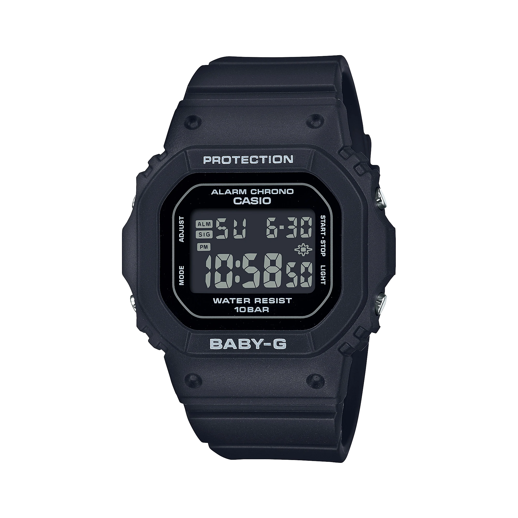 The classic BABY-G square look you love — now in an even slimmer, more compact design. The smaller BGD-565 case is 2.6mm shorter, 2.1mm narrower, and 1.2mm slimmer than its predecessor and is designed to appear flat when viewed from the side, for an even thinner look. In versatile black to match any fashion statement you choose, this watch is an ideal accessory any time of year.