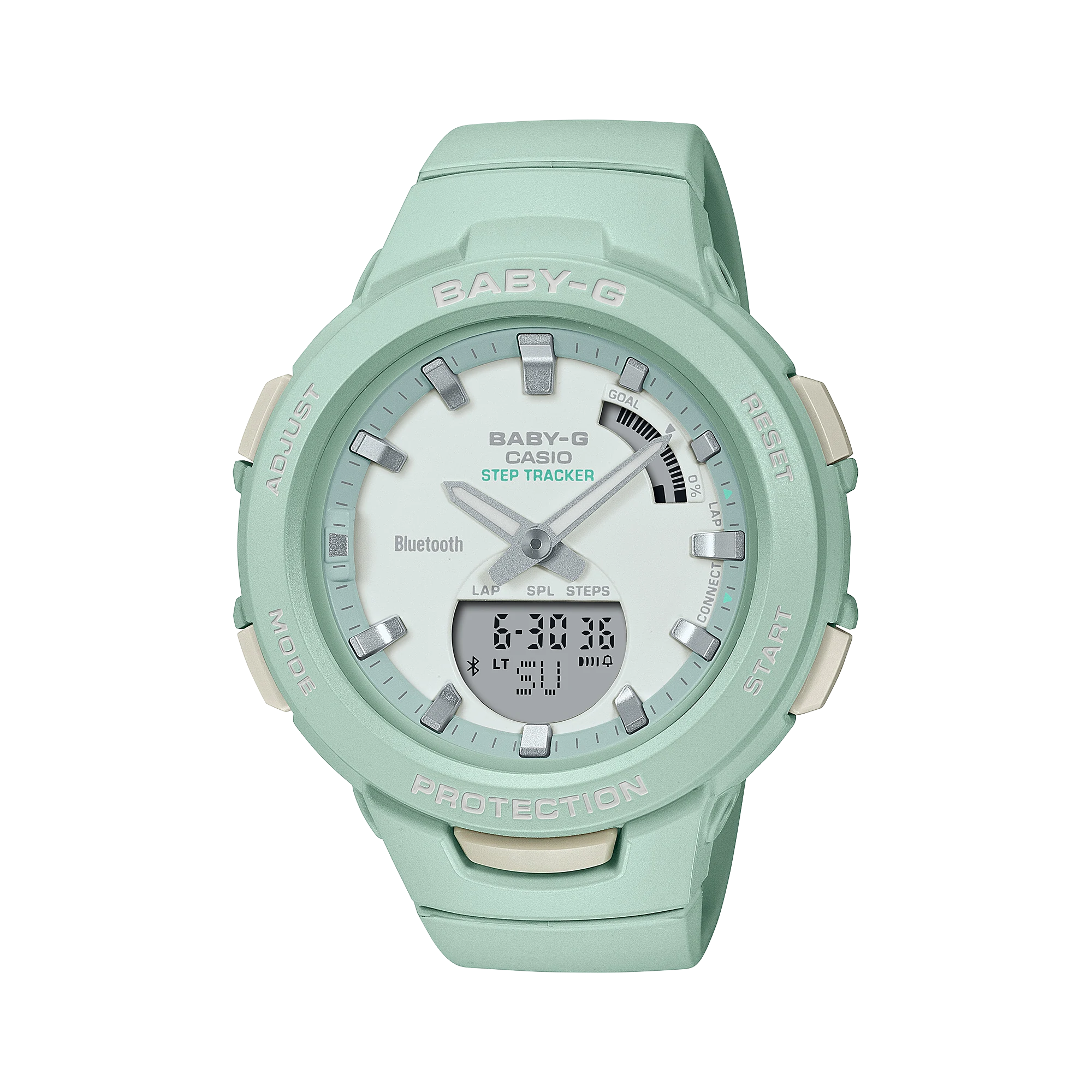 Gratify your love of BABY-G and your passion for working out, with sports watches that sync with your mobile device to enhance your daily workouts. Slip into soft monotone pastels accented with metallic index markings. These practical beauties feature a thin case designed to stay out of your way when exercising, and even an automatic double LED to light workouts in the dark. Take control of your daily exercise and sports activities with smart training support. These BABY-G models are equipped with a step tracker, a timer that can handle up to 5 by 20 sets, lap memory for up to 200 runs, and a step reminder function to stop you from sitting too long. Sync with your smartphone via Bluetooth® for effortless watch operation. Simply tap on the CASIO WATCHES app to easily manage your daily activity logs and exercise settings from your phone. Calculate calories, set step goals, and even create and transfer timer menus, log steps, store stopwatch measurements, and view all calendar data. The sports watch that delivers what you need for a healthy, active life directly to your wrist.