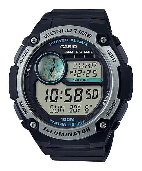 This watch was created for practitioners of Islam, and its main function is prayer time alarm. Once you select your current location (from among 31 time zones, 70 preset cities, and three user-definable cities), the watch will let you know what time (hour and minute) is to pray. In addition to displaying the next upcoming prayer time, the watch can also be configured to sound a prayer alarm. With this watch, you never need to worry about missing any one of the five daily prayer times. • Prayer times and alarms • Hijri calendar function • Big case size • 100-meter water resistance • World time • World map display with curved glass • LED backlight