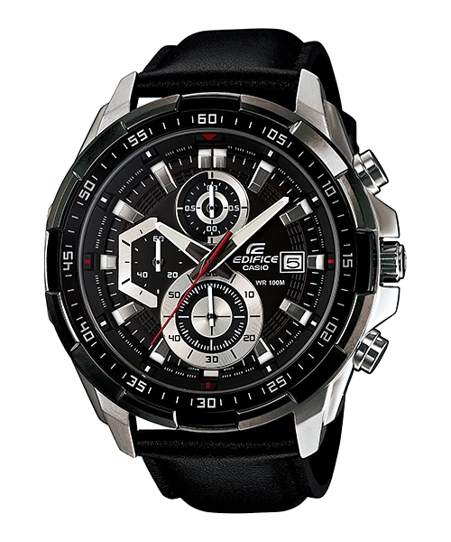A large standard chronograph. The three-dimensional bezel, and strong in-dial design and coloring create a powerful design. Uses a genuine leather band.