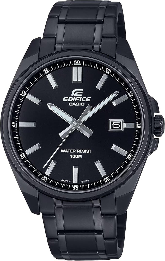 Slip on a contemporary classic — the simple sophistication of an analog design focused on the hour, minute, and seconds hands. Solid, sharp index marks add to the sporty, yet classic look, and the black ion-plated case and band make the statement a bold one. And, as with every EDIFICE, this timepiece delivers 100-meter water resistance.