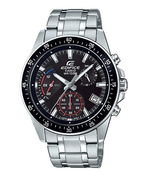 A mid-size standard EDIFICE chronograph. Parts of the dial are finished in red and blue accent coloring to create a tight, sporty design.