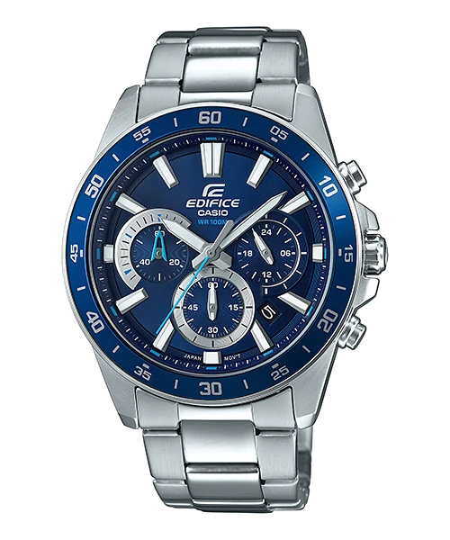 A mid-size standard EDIFICE chronograph. Use of a thick inset dial creates a dynamic design.