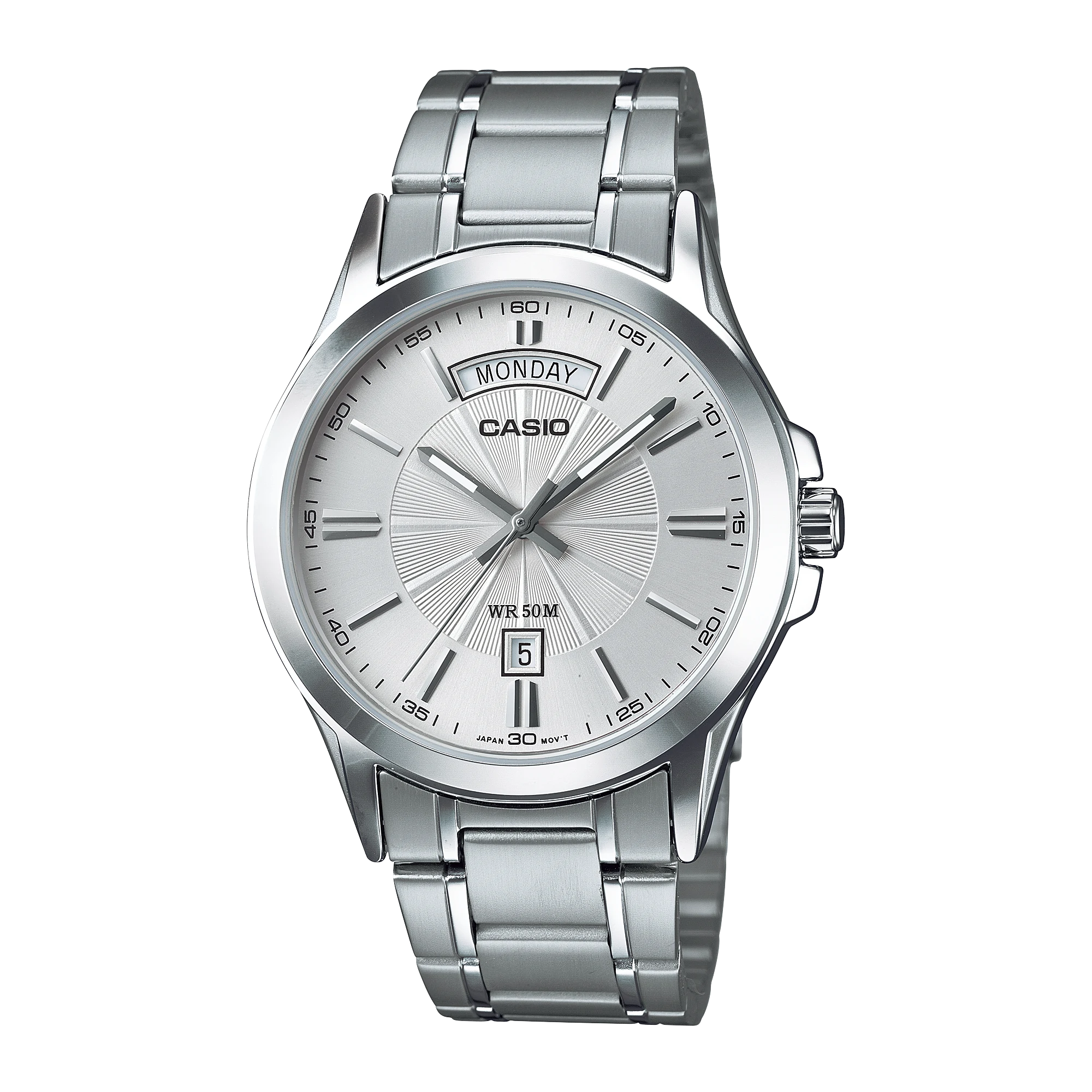• 50-meter water resistance • Day and date display • Stainless steel band • Simple, easy-to-use design