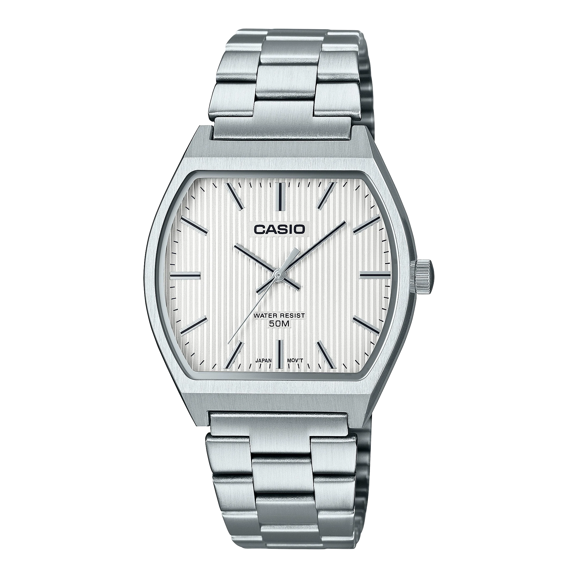 A bold, square version of the classic metal analog watch. Shimmering bar indexes are set against a tasteful face color for a chic and elegant design. Water resistance up to 50 meters frees you from worry on rainy days and when washing up.