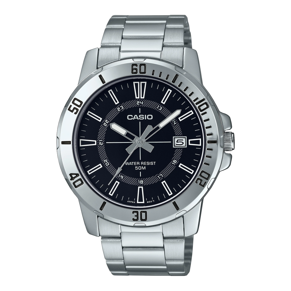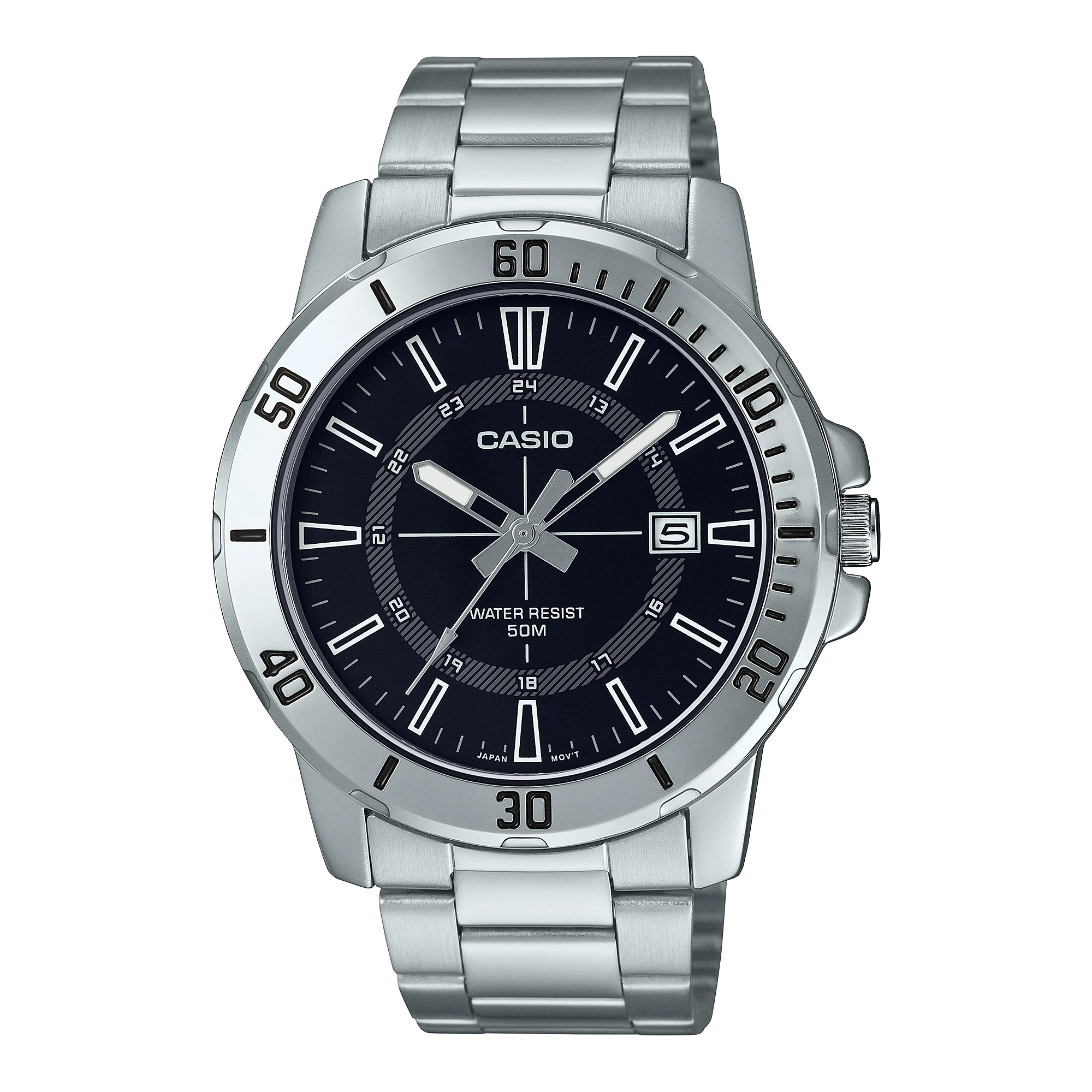 Go sporty and stylishly bold with a metal analog timepiece featuring a thick bezel. Water resistance up to 50 meters and date window at 3 o'clock deliver convenient functionality to easily navigate your active days.