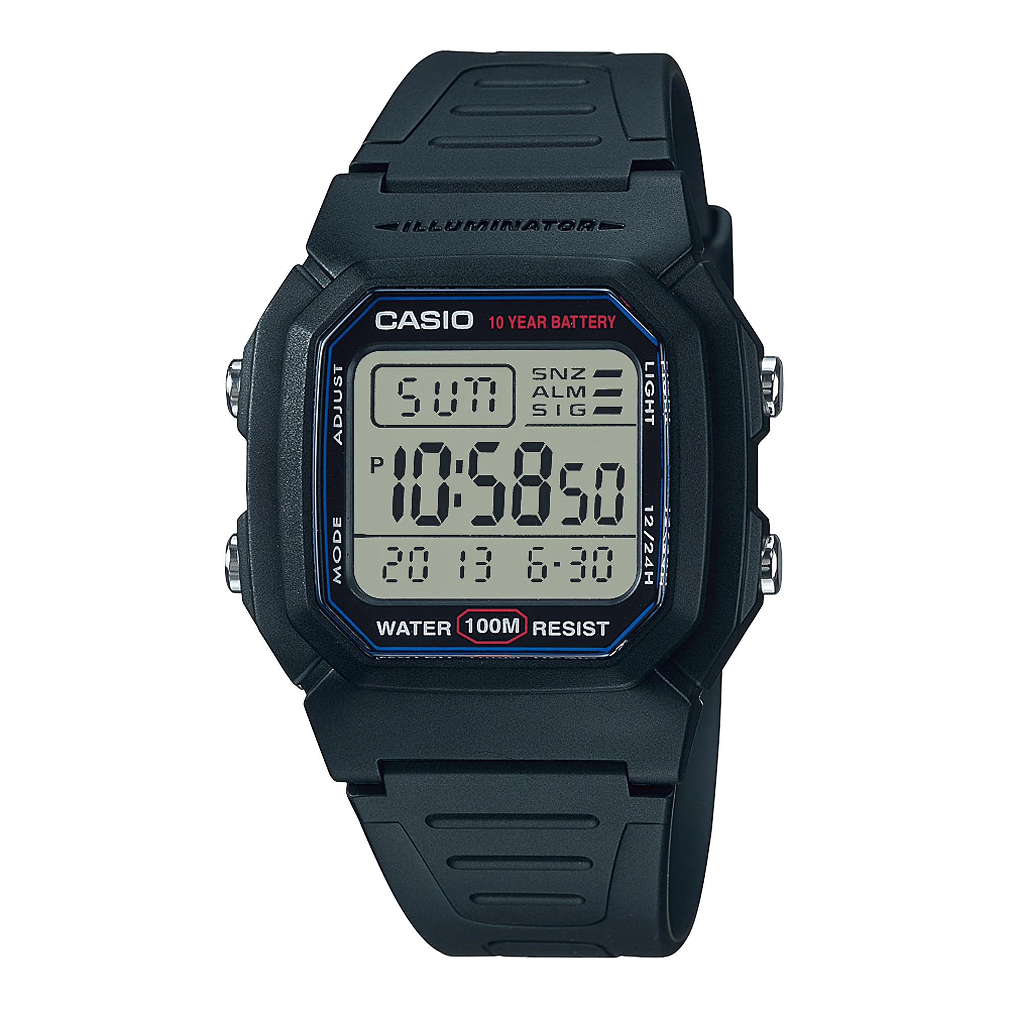 10-year battery life • 100-meter water resistance • LED backlight • Dual time