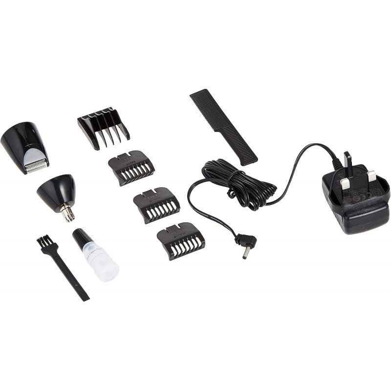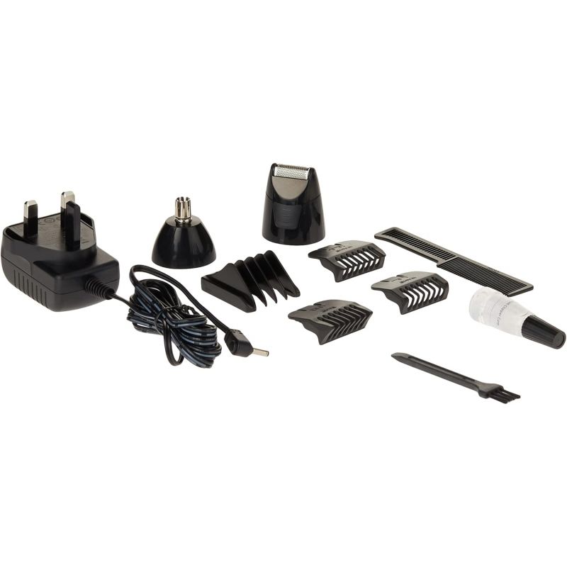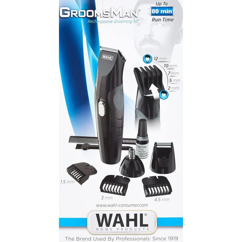 Inside the Box: 1 WAHL Groomsman All-in-One Trimmer, 3 Attachment Combs, 1 Rotary Head for nose and ear hair, foil shaver head, cleaning brush, blade oil, storage pouch, and instruction manual.