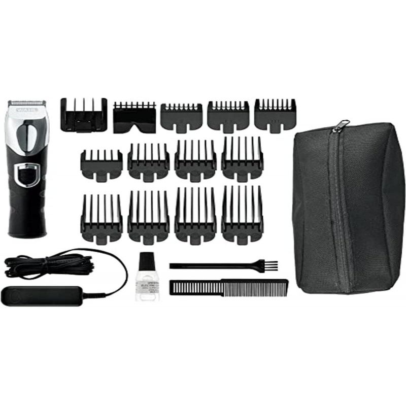 Complete USA Made Grooming System – Everything in one kit. A rechargeable hair trimmer for men featuring our no slip silicone grip for precision trimming, 3 attachment heads, 3 guide combs ranging in size from 1/16” – 3/16", a 10 position guide comb (12mmm – 20mm), a 6 position (1/16” – 1/2") comb, detail brush, and soft case.