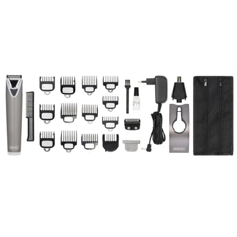 Inside the Box: 1 WAHL Lithium-Ion Stainless Steel Trimmer, 3 Beard Combs (1.5 mm, 3 mm, 4.5 mm), 6-Position Guide Comb (2 mm to 12 mm), Storage Pouch, Charging Stand, Cleaning Brush, and Blade Oil.