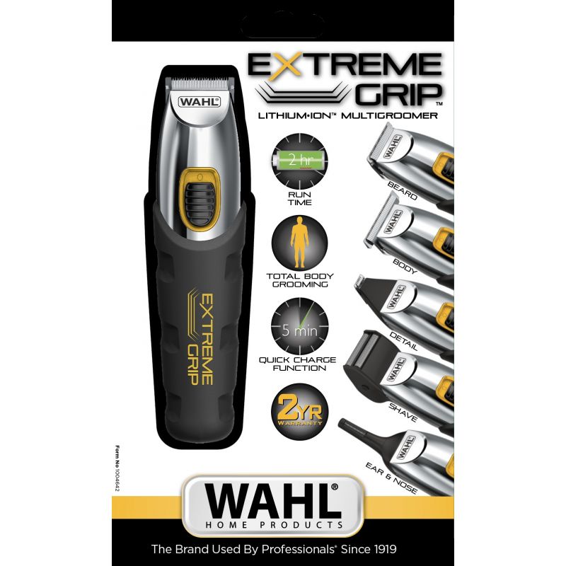 Inside the Box: 1 WAHL Extreme Grip 4-in-1 Multi-Grooming Trimmer, 12 guide combs (0.5 mm to 11 mm), adjustable guide comb, 3 detachable heads, storage pouch, cleaning brush, blade oil, charger, and instruction booklet.